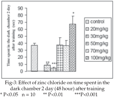On the other hand, statistical analysis of data in the time spent in the dark chamber, shows significant difference between rats where mothers received Zncl2 (20mg/kg/day) at the stage of pregnancy and control group (P<0.01) 48 hour after training, and rats where mothers received (30mg/kg/day) Zncl2, shows significant difference with control group (P<0.001). But in this step, there was no significant difference between control group and rats which their mothers received (50, 70mg/kg/day) zinc at the stage of gestation, where as significant difference between rats which their mothers received (100mg/kg/day) Znc l2 and control group (P<0.05) (Figure-3).