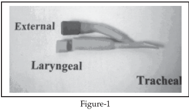 A silicone lined Foley’s catheter was tailored by carefull measurements. A bevel was made at one end while other end had a horizental cut. This tailored Foley’s catheter (Picture-1) was introduced and positioned in such a fashion that the upper end lay just below the level of the vocal cords and the lowered beveled end just above the tracheostomy (Picture-2 & 3).