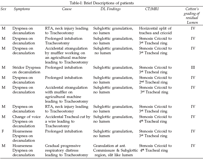 As regards management of the lesion, this study, which comprised of ten cases, is a reasonable example of various modalities available in Pakistan. However 40% had Laryngotracheal stenosis due to prolonged intubation, 20% had strangulation by muffler while working on agricultural machinery, 20% had it due to Road Traffic Accident (RTA). In contrast to another local study4 satisfactory result as far as airway is concerned were achieved in this study. Overall prognosis in laryngotracheal stenosis in terms of good airway and voice is usually unsatisfactory. Literature does not give a good guide for a clear-cut management strategy for this problem. As such conservative means, open repair and endoscopic remedies are employed. Results are universally diversal dissatisfaction. Chronic laryngeal stenosis is a challenging problem, which necessitates surgical treatment to achieve a satisfactory respiratory condition.