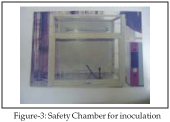In safety bacteriological chamber (Fig-3), 0.5ml of homogenate is taken from homogenizer bag and is placed in already prepared dilution test tube containing 4.5ml of normal saline.