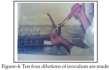 It is properly mixed and then 0.5ml is transferred to second tube of 4.5ml dilution and juster tip is discarded. With new sterilized tip it is again mixed and 0.5ml is transferred to 3rd tube and tip is discarded. In this way four dilutions from each parent bag is made i.e. 1/10,1/100,1/1000 and 1/10,000.(Fig-4)