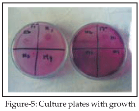 Already prepared blood agar plates are taken and divided into four quadrants as 1/10,1/100,1/1000 and 1/10,000.Each quadrant receive 0.01ml of homogenate, dropped over the blood agar plate from a height of 2.5cm from respective test tubes. Plates were then placed in incubator at 37oC for 15 minutes with lids slightly open at one corner. Lids are then replaced back on plates and plates are incubated for 24 hours. The numbers of colonies are counted at the end of 24 hours (Fig.5).