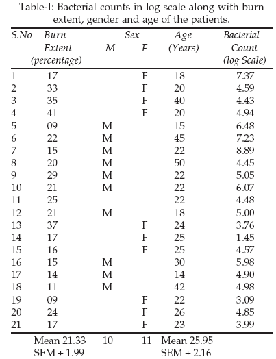 Results: Four specimens were taken each day and repeated on alternate days for up to 6 days. Out of twenty one patients there were 10 male and 11 female with mean age of 25.95 years. Total body surface area burnt was from 9-41%. Bacterial counts obtained varied from 1.45-8.89.