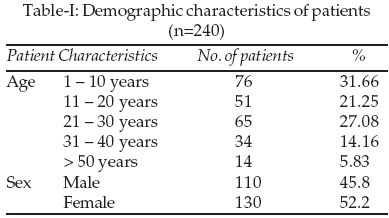 During the study period out of 2200 total admission, 240 patients were admitted with burn injuries, comprising 10.9% of total admissions. The patients included local residents and also Afghan Refugees in different camps. Age of patients ranged from 13 months to 52 years. Children less than 10 years of age comprised the largest number of burn patients (31.66%) and 70% of burns in children were scalds. Young adults between 21-30 years formed the second largest group (27.28%). One hundred ten patients were male and 130 female (Table-I), 163 cases occurred at home or dwelling places.