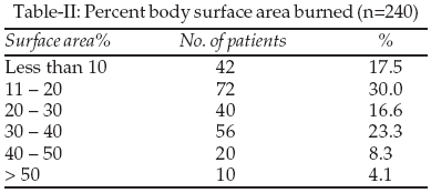Table-II shows the percentage of total body surface area (TBSA) involned. 32 patients had less then 10% TBSA burns mostly scalds in children. 72 patients had 10-20% TBSA burns while 10 had more than 50% TBSA burns.