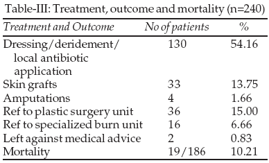 One hundred forty three patients (59.58%) had partial thickens burns while 97 patients (40.42%) had full thickens burns. Patients with scald burns had received some first aid like cold water washing before coming to hospital while majority of other burns patients had no first aid. Nine patient had burns on face mostly scalds and acid burns. Inhalation injury occurred in 33 patients. Minor cases were treated with oxygen and steroids in consultation with ENT department. In major inhalational injury cases multidisciplinary approach including ICU care was employed. Tracheostomy was done in two patients who were then shifted to specialized burns centre. Treatment and out come details are given (Table-III). Healing was better in scalds who had some first aid treatment. 130 patients improved with daily washes dressing debridements and local 1% Silver sulphadiazine cream application. Superficial skin graft was done in 33 cases in 2nd to 3rd week of burn injury, in 1-5 sessions. Graft was commonly taken from thigh skin. However 36 patients were referred to plastic surgery unit for extensive grafts and flap rotation etc. Usually after two weeks. Upper limb amputation was done in one patient, unilateral lower limb in one and bilateral below knee amputation in another patient. Escharotomy was done in 11 patients. 16 patients with more than 40% TBSA burns were referred to specialized burns centre either on demand and few due to severity of injury.
