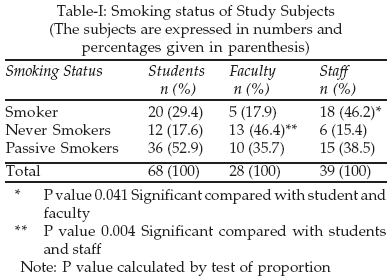 Results: The eighteen staff members were smokers whose number was significantly higher (P value-0.04) when compared with students and faculty members. The thirteen of faculty members were among the never smoker category and their number was significantly higher (P value-0.004) compared to students and staff members while more students were passive smokers (36) as compared to staff and faculty members.