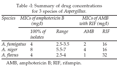 Results: The MIC of amphotericin B for 100% of isolates of A. fumigatus and A. flavus were inhibited by 4mg/lit amphotericin B. 100% of isolates of A. niger were inhibited by 8mg/lit amphotericin B. When amphotericin B was combined with rifampin, amphotericin B MICs decreased to 2, 1 and 4mg/lit in A. fumigatus, A. flavus rephrase and A. niger respectively.