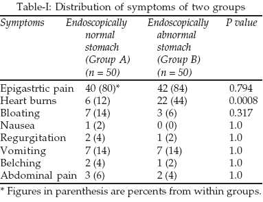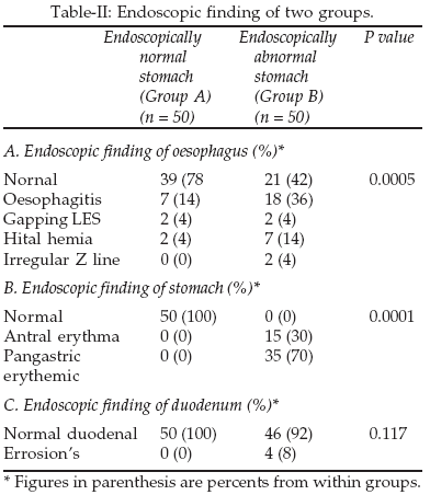 Results: There were 100 patients in the study, 50 in group A and 50 in group B. Mean age in group A was (30.2 years) with 21 (42%) males and 29 (58%) females, while in group B it was 36.4 years with 32 (64%) males and 18 (36%) females. Most common complaint of epigastric pain was present in 40 (80%) patients in group A and 42 (84%) in group B followed by heart burn 6(12%) in group A and 22(44%) in group B. On endoscopy oesophagits was seen in 7(14%) patients in group A and 18 (36%) patients in group B. All patients in group A had normal stomach on endoscopy while in group B 15(30%) patients showed antral erythema and 35(70%) showed pangastic erythema.Duodenum was normal in all Group- A patients while four patients in Group-B had duodenal erosions. Histologically 34(68%) patients were positive for H. pylori in Group-A, compared to 39(78%) in Group- B.