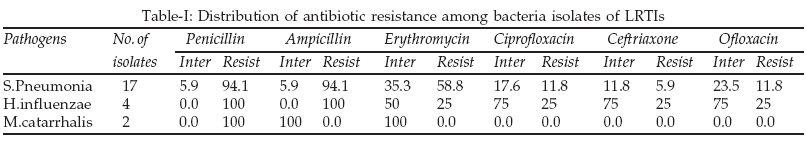 According to our data the prevalence of erythromycin–resistant H. influenzae is 50% of isolates where as isolates from France showed the same result.12 Resistance to the Erythromycin is associated with penicillin resistance.17 Our data showed no fluoroquinolones resistance for isolates of M.catarrhalis. Fluoroquinolone resistance was detected in UK, France and Spain.12,18 Differences in the prevalence of antimicrobial resistance in countries may be due to several factors. Different patterns of antimicrobial usage, which lead to variable selective pressure on resistance, might be one of the primary factors.19 Other factors could be the distribution of specific serotypes and the spread of resistant clones within certain regions. Respiratory tract infections are the most common indication for antibiotic prescription, accounting for 60% of all scripts in the UK. In Europe, >80% of all LRTI are treated with antibiotics.19 Healthcare systems around the world are attempting to minimize costs and at the same time improve overall quality of care. As such continuous study for drug resistance and providing guidelines for the use of antibiotics is suggested.REFERENCES