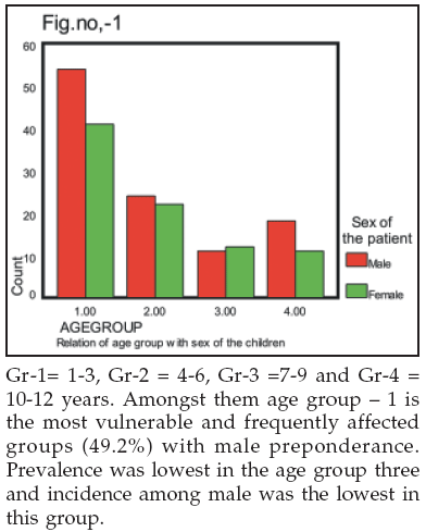 Fig-1 shows different age and sex distribution of cases. There were four age groups. Gr-1= 1-3, Gr-2 = 4-6, Gr-3 =7-9 and Gr-4 = 10-12 years. Amongst them age group – 1 is the most vulnerable and frequently affected groups (49.2%) with male preponderance. Prevalence was lowest in the age group three and incidence among male was the lowest in this group.