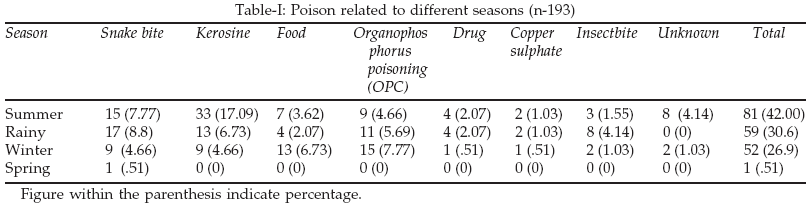 Methodology: The study was done in Khulna Medical College Hospital from January 2004 to December 2005. The cases were studied to see the seasonal variations and other epidemiological and clinical parameters. One hundred ninety three patients enrolled in the study were divided in four groups. Prevalence and type of poisoning was observed in winter, spring, summer and rainy seasons respectively.