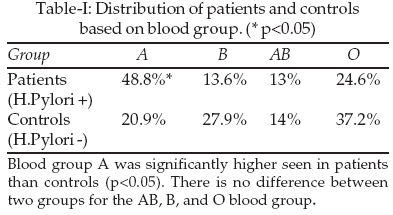 This case- control study was carried out on the children aged 4-14 years who had gastrointestinal symptom such as epigastric pain, vomiting, heart burn. These children underwent Endoscopy after parent’s consent. The patients who have previous history of antibiotic therapy since last month and history of omeprazole since two weeks ago, and known history of H-pylori were excluded from our study. A total of 47 patients were included in this study and similar number of 47 age and sex matched control were selected. Patient’s data such as age, sex, risk factors were recorded in the questionnaire. Blood group was identified before endoscopy. The children who had positive urease test were classified as patients group and children without positive urease test were classified as control group. All patients had matched with control for age and sex. T-Test and Chi-square were used for data analysis. Odds ratio and Confidence interval with 95% were calculated. Data were analyzed with SPSS for windows.