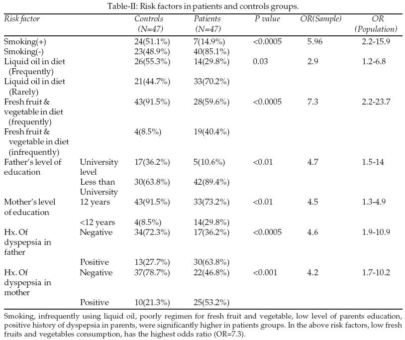 Results: The number of family members were 4.1±1.2 in the control group and 5.7±1.2 in the patients group. Attitude were higher in the patients group toward low consumption of fruit, vegetables, liquid vegetables, seed oil, smoking in family, low level education of parents, blood group A and parents dyspepsia. In the all risk factors CI >1.0 and P<0.05.