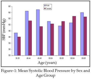 Table-I shows the mean values of the cardiovascular risk factors in the sampled population. The mean SBP prevalence was higher in men than in the women, going up to peak between 45-49 years ini men and 60-64 years in women (Fig-1).