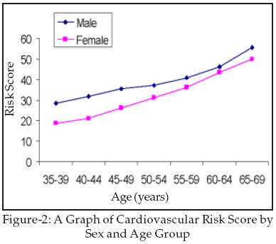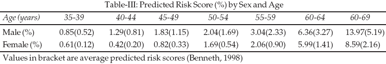 Fig-2 shows the cardiovascular risk score of the subjects. The result shows that the risk score increased progressively as the age increased with the men having a significantly higher (P < 0.05) risk score than the women. The predicted risk score (%) of the subjects (Table-III); show that the chances of death from CV sources in the next five years increased with age.