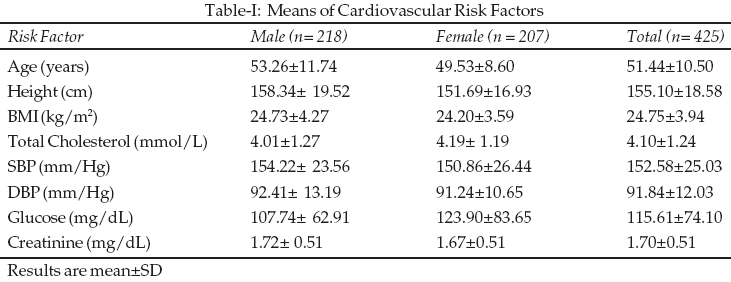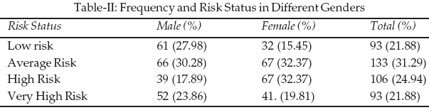 Table-II shows the frequency and risk status in the different genders. Ninety-three participants (21.88%) were grouped as low risk while 133 participants (31.29%) were averagely at risk to CVDs. Of the 106 participants that were on the high risk group, 17.89 and 32.37 percent were males and females respectively.