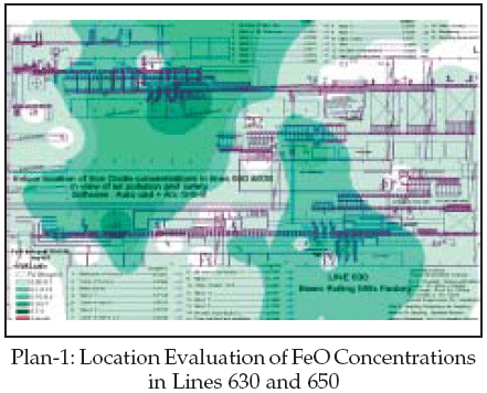 Hundred percent mean value of Iron oxide concentrations i.e. 20 stations in production lines 650 and 630 are at a safe level (Plan-1). The average of FeO concentration in lines 650 and 630 is 0.23 and 0.11mg/m
