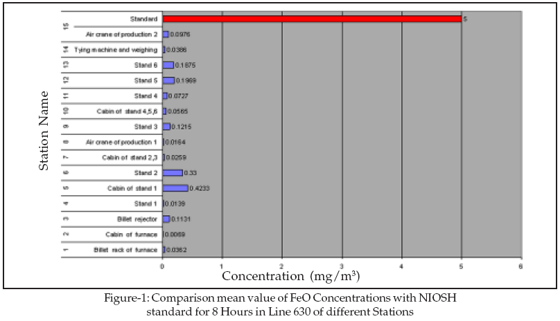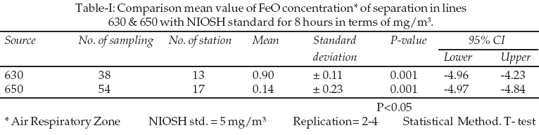 3) (P< 0.05). The average of FeO concentration in lines 650 and 630 is 0.23 and 0.11mg/m3, respectively, with confidence interval of 95% which is much lower than NIOSH standard value (Table-I). Because, after doing different phases of milling process, there is an erosion of oxides on the billets. As the result, airborne iron oxide fumes decrease in worker’s respiratory air zone. Meanwhile, there are differences in calibrations and number of stands in line 650 and 630.
