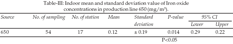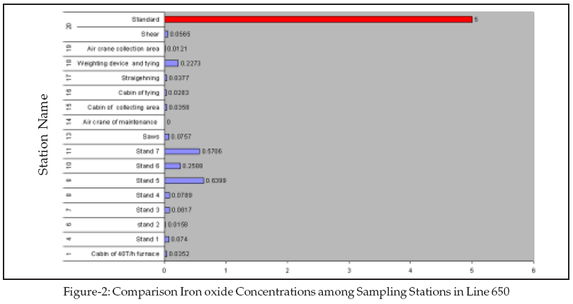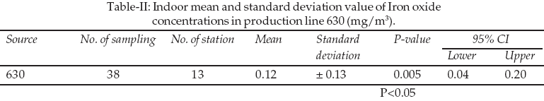 Conclusion: It is not a serious health problem for workers. 100% Mean value of Iron oxide concentrations i.e., 20 stations in production lines 650 and 630 are at a safe level.