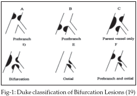 Lesions were angiographically classified based on the Duke classification (Fig-1). The technique of treatment was similar in all patients. If the diameter of side branch was 2mm, both the main and side branch were wired, the main vessel was then stented with the side branch wire jailed and then if needed guide wire exchange, kissing balloon dilation and provisional stenting of the side branch were performed. 12-lead electrocardiogram (ECG) before, one hour and 24 hours after the procedure was taken. Creatine kinase, MB isoenzyme every 8 hours was measured in all patients for 24 houres.