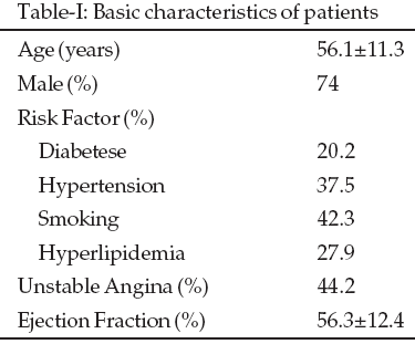 Patients’ characteristics: The mean age of the patients was 56.1±11.3 (range 32-94). Seventy-four percent of patients were male, 20.2 had diabetes mellitus & 44.2% presented with unstable angina. The details are given in Table-I.