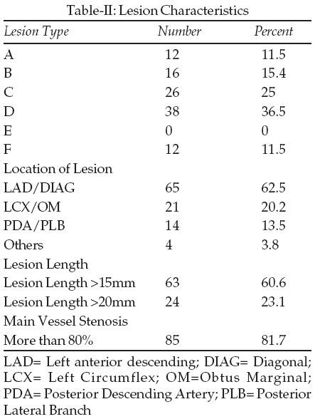 Angiographic analysis: The most frequent lesion was Type D (36.5%) and the most frequent vessel involved was left anterior descending/diagonal (62.5%) (Table-II).