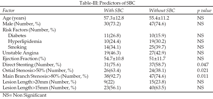 SBC occurred in 41 patients (34.4%), of whom 30 patients were male (Table-III). There was no statistically significant correlation between SBC and age, sex, and clinical characteristics. Ejection Fraction and SBC had no significant statistical correlation. After direct stenting the probability of SBC was higher than doing predilation and then implanting the stent in the main branch (p=0.047). When the ostial stenosis was more than 50%, the probability of SBC was higher than patients without such a lesion (p=0.021) and when the diameter stenosis of the main vessel was more than 80%, the probability of SBC was significantly high (p=0.011). Using multiple logistic regression, only main branch stenosis more than 80% had significant association with SBC [OD: 5.91; 95% CI (1.28-27.3); p=0.023]. Lesion length had no effect on SBC.