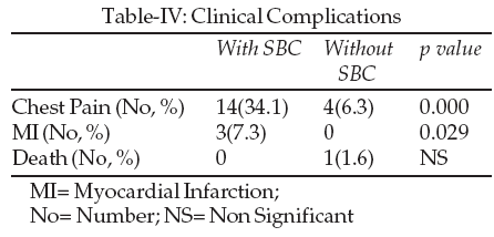 Chest pain during or after finishing PCI occurred in 18 patients (34%), of whom 14 cases were when SBC occurred; only 6.3% of patients without SBC had chest pain and this difference was significant (p<0.001) (Table-IV). Three non Q-wave MI (2.9%) occurred, all following SBC (p=0.029). The rate of non Q-wave MI after SBC was 7.3%. In all of these three cases wiring of the side branch after stenting the main branch was not successful. We had one death as a result of fatal arrhythmia.