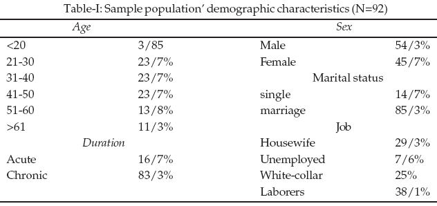 7 the chance of the patients with one of the psychiatric disorders in I Axis for chronic inabilities is significantly more than the others.8 Although, in another study, pain behavior did not correlate with anxiety or depression but correlated with measures of disability and pain intensity.9 Using diagnostic methods, the present studies have shown psychological and psychosocial factors are more important than medical exploration and distinct physical phenomena in the incidence of LBP.4 In a study on retail material handlers, dissatisfaction was shown as a major factor in the incidence of LBP.10 The findings of another study conclude work hardening and a contented ethos of the manual labors under study have moderate association between the prevalence and etiology of LBP.11 Today, researches, considering behavioral, educational and psychological factors’ role in the functional rehabilitation programs for LBP chronic patients, have combined the treatment with relaxation, ergonomic, aerobics and physiotherapy.12 Another study’s results suggest the presence of non-organic signs should alert the physical therapist of the need for additional psychological tests and should not necessarily be considered an indicator of malingering.13 The prospective studies indicated that psychological variables were related to the onset of pain, and to acute, sub acute, and chronic pain14, but there is no relation between the acute and chronic pains with pain’s dimensions.15 Moreover, women reported higher levels of psychological distress than men16 and find more functional limitations in job decision latitude.17 Considering previous studies, the purpose of this study was to assess psychological problems in LBP patients in order to show the necessity of a psychological assessment for a better diagnosis and therapy of this illness.METHODOLOGY