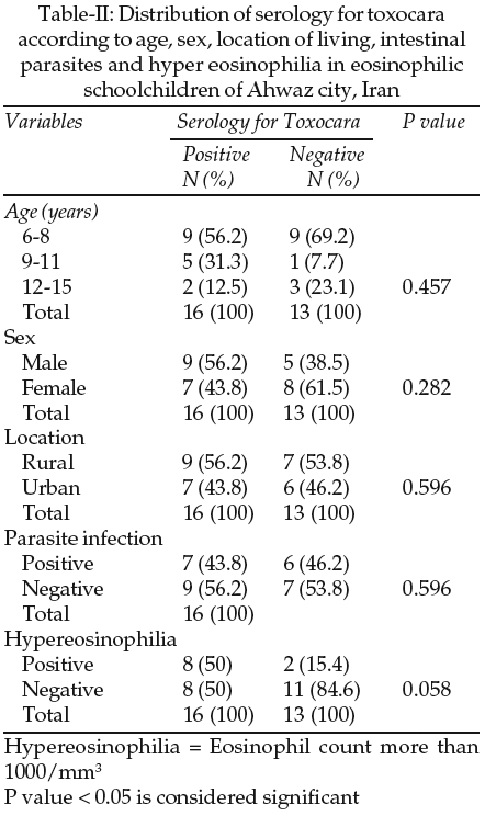 10 with 25.6% in Shiraz (Iran), Santos et al4 with 39% in Brazil and Hayashi et al11 with 84.6%. There are several factors that make it difficult to compare this study with others, such as small number of children having Toxocara antibody and design of study (limited to eosinophilic patients with chronic cough). However, religious behaviors in Moslem that forbid them of close contact with dogs may contribute to low frequency of seroprevalence of Toxocariasis in Iran. Ahwaz city is considered to be an endemic area for intestinal parasites, which may have cross reactivity to toxocara.7 However, present data (Table-II) discarded a correlation between the presence of intestinal nematodes and anti Toxocara antibodies (p>0.05). In this study there was no significant gender difference in Toxocara antibody, that is consistent with Sajjadi et al and Santos et al reports.4,10Our study presents no significant age difference in Toxocara antibody frequency (p>0.05) that was consistent with Sajjadi et al report