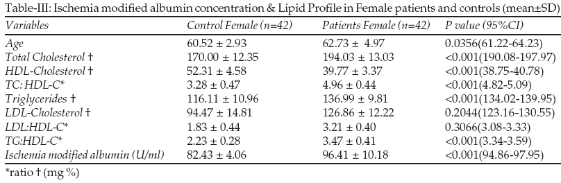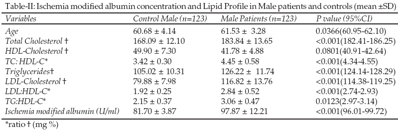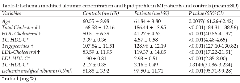 Results: Serum IMA levels were significantly increased in MI patients as compared to control (p<0.001). Also total cholesterol, TC: HDL-C ratio, triglycerides, LDL-cholesterol, LDL-C: HDL-C ratio and TG: HDL-C ratio were higher in AMI subjects (p<0.001) and HDL-cholesterol were lower in MI patients (p<0.001).