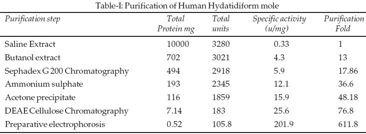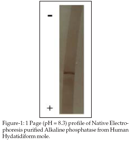 Methodology: The sample of mole Hydatidiform subjects from Taleghani Hospital, Tehran, Iran was studied. An Alkaline phosphatase from Human Hydatidiform mole was purified by a protocol involving solubilization using precipitation by butanol, acetone, Ammonium sulphate, Sephadex G200, Ion exchange chromatography and preparative electrophoresis .