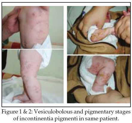 1-6 In the present case, the patient had skin lesions at her birth, which confirms that the disease can start in utero, as reported by other authors.2 In follow-up study at 4 month old, the infant had normal growth and development, her head circumference, hair and nail were normal, and ophthalmologic examination was negative. The skin lesions were in hyperpigmentation stage with macular hyperpigmentation in a swirled pattern along the lines (Fig-2).IPS is an X-linked dominant condition but genetic heterogenicity may exist, for this reason all the patients with it must have complete family physical studies.
