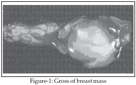 density in the lower inner aspect of her left breast on her first screening mammography. A breast tissue specimen measuring 4 x 2.5 x 1 cm (Figure-1) was surgically removed.