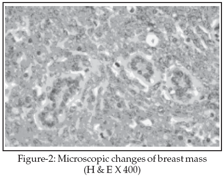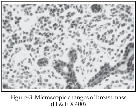 Microscopic sections revealed a 7-mm nodule containing malignant round cells & hyperchromatic nucleus, numeous mitosis, consistent with metastaic leukemic cell to the breast (Figures-2&3), the patient were treated for two years for myloid leukemia. The patient had no other evidence of metastatic disease. Metastasis to the breast from an extramammary malignancy is a rare finding. Its clinical incidence varies from 0.5 to 2%.1-3