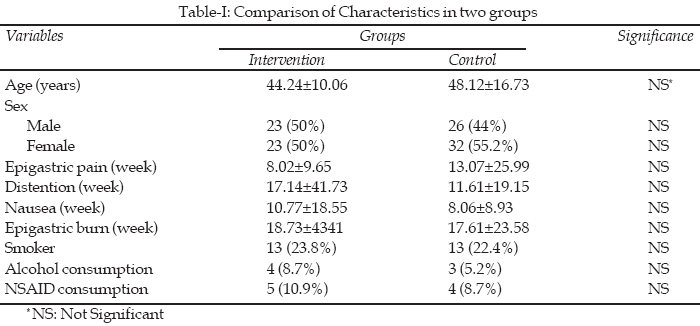 Of 104 patients, 46 patients (44.2%) were in intervention group and 58 patients (55.8%) in control group. Four patients in intervention and six in control group did not agree to have follow-up endoscopy. Demographic characteristics and patient’s history have been shown in Table-I. In intervention group, the ulcer size of less than 30 mm was in 32 (69.6%) and more than 30 mm was 14 (30.4%). In the control group 43 ulcer cases(74.1%) were less than 30 mm and 15 cases (25.9%) were more than 30 mm; so there was no significant difference between two groups (p>0.05). The location of ulcers was as follows: 29 (27.9%) ulcers in stomach, 75 (72.1%) in duodenum, four (3.8%) in stomach, 17 (16.3%) in antrum, four (3.8%) in fundus, four (3.8%) in cardia, 70 (67.3%) in first part of duodenum and five (4.8%) in second part of duodenum.