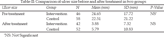 The mean size of ulcers in intervention and control group before treatment were 24.6 (±17.7) mm and 22.5 (±21.2) mm which means there was no significant difference. The mean percentage size reduction of ulcers in intervention and control group after treatment were 92 (±14) and 89.4 (±16.4) percent. There was no significant difference in mean of ulcer size between intervention and control groups, before and after treatment (Table-II).