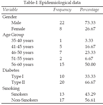 Over a period of two year, thirty diabetic patients with foot complications were included in the study. Foot complications were abscess, cellulitis, ulcer and gangrene. Demographic profile of patients is shown in Table-I.