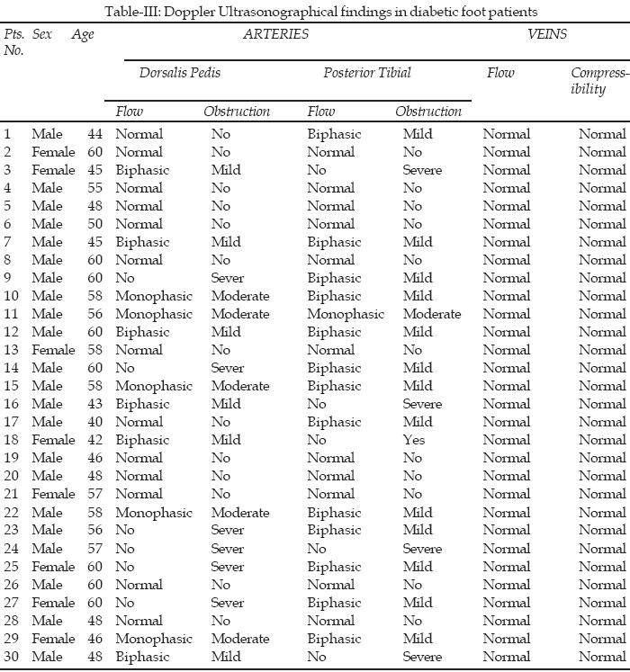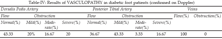 The results of the vasculopathy given in Table-III and Table-IV show that flow in the dorsalis pedis artery was normal in 13 (43.33%) cases with mild obstruction in 6 (20%), moderate in 5 (16.67%) and severe obstruction in 6 (20%) patients. The flow in the posterior tibial artery on the other hand was normal in 11 (36.67%) cases with mild obstruction in 13 (43.33%), moderate in one (3.33%) and severe obstruction in 5 (16.67%) patients. No obstruction in the venous flow was noted.