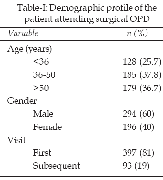 Four hundred ninty patients were interviewed while attending Surgical OPD of Civil Hospital, Karachi after taking verbal consent during the study period from March to May 2008. Mean age of the patients was 45.0±13.52 years (Range: 12–85). Three hundred ninety seven patients were visiting OPD for the first time. Demographic profile of all patients is shown in Table-I.
