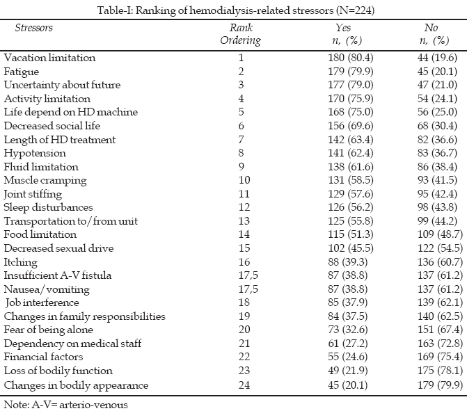 The most frequent stressors reported were: limitation of vacation (80.4%), followed by fatigue (79.9%), uncertainty about future (79.0%), limitation of activities (75.9%) and life depend on hemodialysis machine (75.0%), as shown in Table-I.