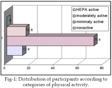 The mean energy expenditure per week was 344.81 calories (SD=318.33). There was no vigorous physical activity among participants and only 15.6% of participants had moderate physical activity. About 71.4% of participants had light physical activity, mostly walking. (Figure-1)