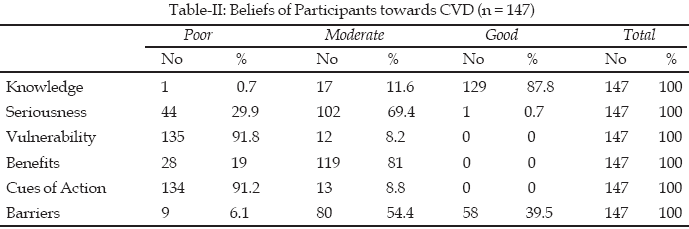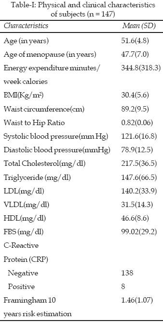 The mean age of participants was 51.6 years and mean age of menopause 46.7 years. The physical and clinical characteristics of participants are listed in Table-I. Most of the participants had good knowledge about CVD, but their attitude toward CVD risk factors was weak (Table-II).