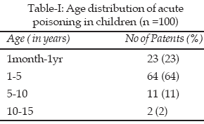 This descriptive case series study was conducted at the Department of Paediatrics (Emergency and General Paediatric wards), Khyber Teaching Hospital Peshawar from January 2007 to July 2007. A total number of hundred children, age one month to 15 years presenting with definite history of exposure to toxic substances or clinical features suggestive of possible poisoning were included in the study. Children with insect bite and chronic poisoning were excluded.