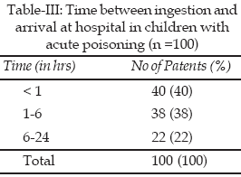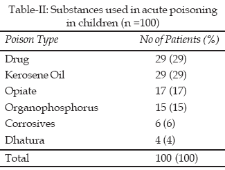 Methodology: This was descriptive case series study conducted at the Department of Paediatrics (Emergency and General Wards), Khyber Teaching Hospital, Peshawar from Jan 2007 to July 2007. A total of hundred patients with history of acute poisoning were subjected to detailed history and examination regarding different aetiological agents, time interval between ingestion of agent and report at hospital and hospital outcome.