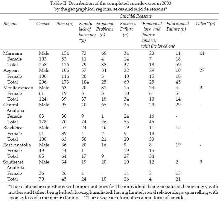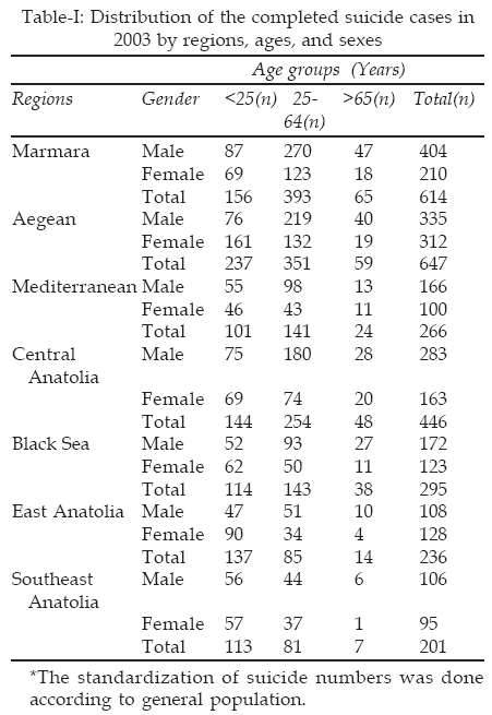 The distribution of the completed suicide cases in 2003 by regions, ages, and sexes is presented in Table-I. For the completed suicide cases in 2003, it revealed an important relationship between the geographical regions and age groups (c