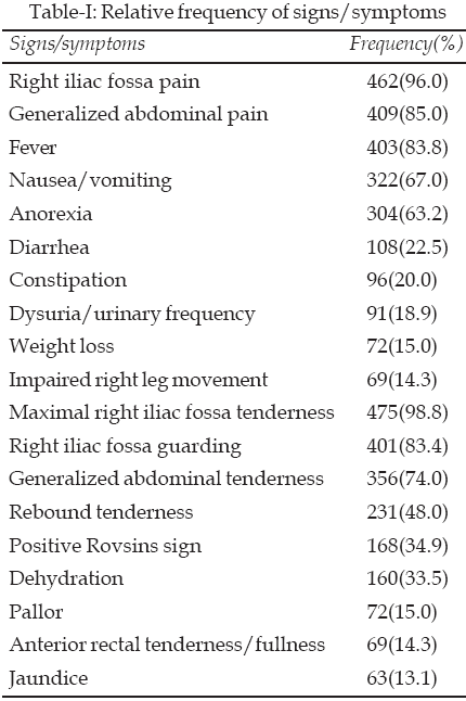 Table-I shows the relative frequency of the signs and symptoms at presentation over ten years. Right iliac fossa pain 462 (96.0%) was the most common symptom with the least common symptom being impaired right leg movement and walking recorded in 69 (14.3%) children. Maximal right iliac fossa tenderness was the most common sign as recorded in 475 (98.8%) with jaundice recorded in 63 (13.1%) being the least frequent sign. The signs and symptoms occurred in various combinations in especially those children who presented with sub-acute and recurrent appendicitis. The classical signs and symptoms of appendicitis were altered by medications taken before presentation while many children already had complications on arrival. These resulted in diagnostic difficulty in many of them.