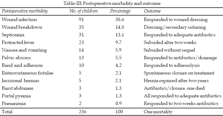 1,2,10,21 Preoperative peritonitis has been reported to result in post operative band and adhesion formation with resultant intestinal obstruction which may necessitate re-exploration and adhesiolysis but these were rare in this series (Table-II). Similarly, wound infections have resulted in incisional hernias which are successfully repaired as seen in this and other studies.13,14 However, enterocutaneous fistula, portal pyemia and burst abdomen were difficult post operative morbidities to manage in this study and one child who had burst abdomen succumbed due to overwhelming sepsis. This is at variance with previous report14 in this subregion in which no mortality was recorded despite similar spectrum of post operative morbidity. The 0.2% mortality recorded in this study however agreed with literatures1,2,10,21 but morbidity recorded in 236 (49.1%) children was exceptional.CONCLUSION