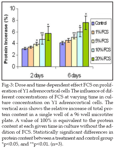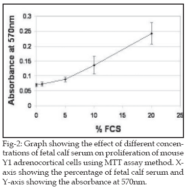 Methodology: Effect of different concentrations (0, 1, 5, 10 and 20%v/v) of FCS on cellular proliferation was determined by the uptake of crystal violet, MTT assay. Total cellular protein was also measured colorimetrically to observe the effect of FCS on growth of mouse Y1 adrenocortical cells.